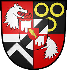 Écartelé: aux 1 et 4, de gueules, à une tête et col de loup d'argent, languée de gueules, celle du 1 contournée ; au 2, de sable, à trois annelets d'or; au 3, de sable, au chevron d'argent et au chef du même. Sur le tout écartelé: a. et d. de gueules au gonfanon d'argent; b. et c. d'argent à la barre de sable. Sur le tout du tout de gueules à une arête de poisson d'or, en bande.
