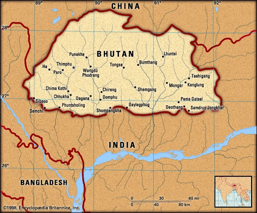 Le Bhoutan est un pays d’Asie du Sud sans accès à la mer. Il est situé dans l’Est de la chaîne de l’Himalaya, enclavé entre l’Inde au sud, à l’est et à l’ouest et la Chine au nord. |