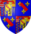 Écartelé, en 1 et 4 coupé et parti en 3, au premier fascé de gueules et d'argent,au second d'azur semé de lys d'or et au lambel de gueules, au troisième d'argent à la croix potencée d'or, cantonnée de quatre croisettes du même, au quatrième d'or aux quatre pals de gueules au cinquième parti d'azur semé de lys d'or et à la bourdure de gueules, au sixième d'azur au lion contourné d'or, armé, lampassé et couronné de gueules, au septième d'or au lion de sable armé et lampassé de gueules, au huitième d'azur semé de croisettes d'or et aux deux bar d'or. Sur le tout d'or à la bande de gueules chargé de trois alérions d'argent le tout brisé d'un lambel et d'une bordure de gueules ; et en 2 et 4 d'azur aux trois fleurs de lys d'or et au baton péri de gueules