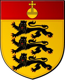 D'or aux trois léopards de sable, à l'orbe crucifère d'or sur champ de gueules utilisée en chef.